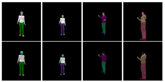 Image pairs obtained by rendering mesh models in the Pose-Varying Human Model (PVHM) dataset [8]. Top: front-view images, bottom: back-view images. The left and right two columns show rendered images of single models, respectively.