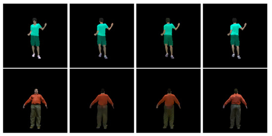 To train the generator, we need a large number of aligned human front- and back-view image pairs. In practice, however, it is difficult or impossible to obtain such aligned image pairs without reconstructing watertight 3D mesh models of the subjects. Natsume et al. used commercial datasets consisting of 3D human mesh models, which were captured by 3D scanners and then handcrafted [3]. The datasets are, however, highly expensive. In this paper, we use the publicly available Pose-Varying Human Model (PVHM) dataset [8], consisting of 10,200 mesh models of 22 different hand-crafted appearances. The model with each appearance is deformed from 200 to 1200 different poses. The models are separated into training, validation, and test sets, among which only the training set is used for training of the network parameters. The validation set is used for regularization of the network parameters, and the test set is used for the reality evaluation in Section 4. The appearances in ‘9200–9999’ and ‘10,000–10,199’ are used for validation and testing, respectively.