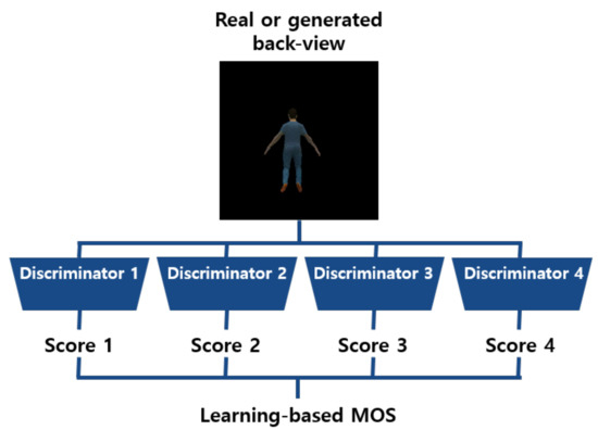 Computation of the proposed learning-based MOS. For a human back-view image, different discriminators compute scores to produce a mean opinion score.