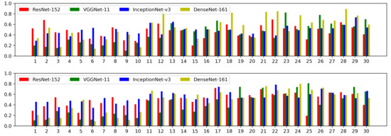 We can employ any discriminator as an evaluator as long as it returns reasonable outputs that are not uniform. For example, if the discriminator consistently returns either 1 or 0 irrespective of the input image, then it is highly biased and the scores should be removed before computing the mean score. In this paper, we use four different networks: the VGGNet, ResNet, InceptionNet, and DenseNet [11,17,20,21]. Each network was ranked first or second in the ImageNet Large Scale Visual Recognition Challenge (ILSVRC). Our detailed architectures are VGGNet-11, ResNet-152, InceptionNet-v3, and DenseNet-161. For the networks with an input size of pixels, the back-view images were resized to fit the scale. The networks have been trained on the ImageNet dataset consisting of a number of different objects. To prevent the discriminators from becoming experts in distinguishing domain-specific generated images from real ones, we only train the fully-connected layers that have been modified to provide binary class labels. This is intended to reflect the requirement of subjective testing [6] that the specialist can not be an evaluator. We used the PyTorch package [22] for the implementation, which provides pre-trained weights of the network architectures.