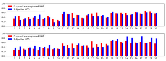 Comparison of the proposed learning-based MOS with the normalized subjective MOS. Top: PVHM test set, Bottom: Actual dataset. x-axis: image index, y-axis: score.