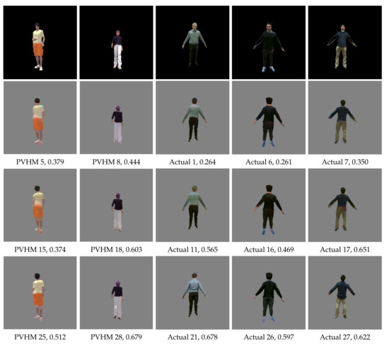 To quantify the similarity of the proposed method to the subjective MOS test, we performed a subjective test on selected back-view images. First, we randomly selected 10 triples of rendered, L1-generated and SiCloPe-generated back-view images from the PVHM test set. Second, we randomly selected such 30 images from an ‘Actual’ dataset. To build the Actual dataset, we rendered 3D mesh models of real people, obtained by using the scanning method in [23]. The second row of Figure 3 shows samples of the back-view images generated from the Actual dataset. We use the Actual dataset to provide approximate results of applying the proposed method to back-view images generated from real photos. The Actual dataset enables comparisons of the generated images to their aligned realistic rendered back-view images, which can not be provided by a dataset with only real front-view images. The total number of back-view image triples of the PVHM test set and the Actual dataset is much larger, but we could not increase the number of test images due to the recommended limit of the overall duration of a subjective test session [6].