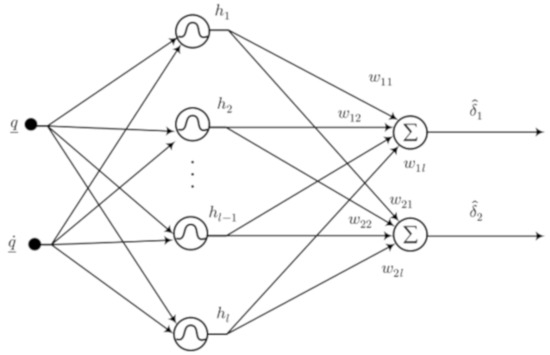 In estimation of the nonlinear characteristics of a system, a two-layer RBFNN is frequently utilized, where the input layers are the radial neurons while the output layers are the linear neurons. In this work, we define the inputs for the RBFNN as and for the position vector and the velocity vector, respectively. And is defined as the output of the RBFNN. Inside the RBFNN, we denote as the ideal weight matrix, where l is the number of the neurons in a hidden layer. Moreover, the activation functions are summarized by , where their component is computed by