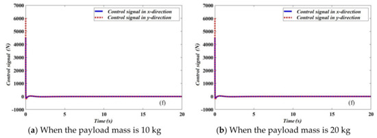 In order to verify the consistency of the control performance in the 3D crane system given the uncertainty of the payload mass, we set the two different cargo mass values at 10 kg and 20 kg, respectively, in the two different transporting operations, which were unknown to the controller. It can be seen that though the payload mass was unknown, in both of the transporting operation scenarios, the control force signals in each direction as demonstrated in Figure 4 were quite similar. That is, the control input was mostly independent from the payload mass.