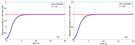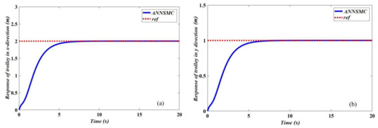 From Figure 5 and Figure 6, it can be clearly seen that after about 5 s, in both scenarios, the trolley reached within 99% of the desired position. More importantly, in both of the illustrated examples, the responses of the trolley were highly comparable, although the crane transported the different payload masses. The similarity in the trolley responses was a result of the similar control inputs, which were adaptively computed by the RBFNN and adaptation mechanisms, as demonstrated in Figure 4.