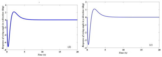 Now let us examine the outputs of the 3D overhead crane system in the two transporting operation scenarios conducted. This under-actuated mechanical system has four outputs, including the two coordinates of the trolley positions as shown in Figure 5 and Figure 6, and the two sway angles in each experiment as demonstrated in Figure 7 and Figure 8, for the simulations of the payload masses of 10 kg and 20 kg, respectively.