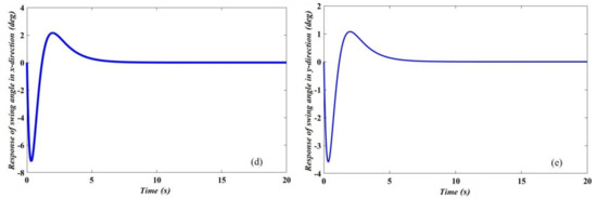 In addition to the positions of the trolley, the two other outputs of the gantry crane included the payload swing angles, as illustrated in Figure 7, and the consistency of the control performance, as shown in Figure 8, where the maximum sway angles in the two presented directions in any scenario were about 8 and 4 degrees. These characteristics of the proposed control algorithm are practically crucial in terms of maintaining the reliability, stability and robustness of the closed-loop control system. In other words, the designed controller is highly applicable.