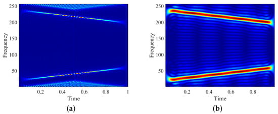 Here, and are TF rearrangement factors, is the second-order estimate of the instantaneous frequency of signal. Compared with the first-order SST, VSST obtains more accurate instantaneous frequency estimation by adding the adjustment factor , meaning the TF concentration can be further improved. The original signal can be quickly recovered using the following formula []: