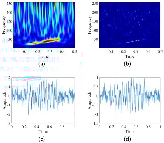 STFT and SST of the simulation signal and the comparison of original signal and reconstructed signal. (a) STFT, (b) SST, (c) original signal, (d) reconstructed signal.