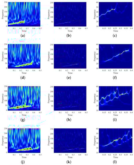 where is the signal with multipath effect, is the ratio of amplitude of multipath effect to that of signal. Figure 8 shows the SST of the simulation signal in Equation (21) with multipath effect under different . Here, time delay has two conditions: and 128 sampling points. The SNR is 0 dB. From Figure 8a,d,g,j, it can be seen that multipath effect can cause a great adverse impact on SST feature. Figure 8c,f,i,l manifest that VSST can separate the multipath component from the signal and suppress it effectively.