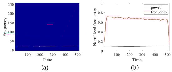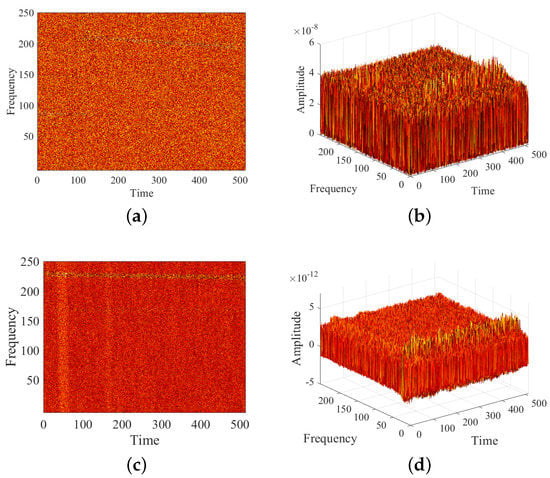 Because of the property that the energy of a signal is mainly concentrated near the instantaneous frequency points, it is only necessary to extract vital frequency, energy, and time-varying information. The effect of first-order SST is better only when the second derivative of the phase with respect to time is approximately zero or much smaller than its first derivative. However, for complex frequency modulation signals, such as secondary frequency hopping signals, the second derivative of phase is not negligible. Hence, vertical synchrosqueezing transform (VSST) is proposed []. In this paper, VSST is used as the TF analysis tool because the experimental datasets contain numerous complex modulation signals.