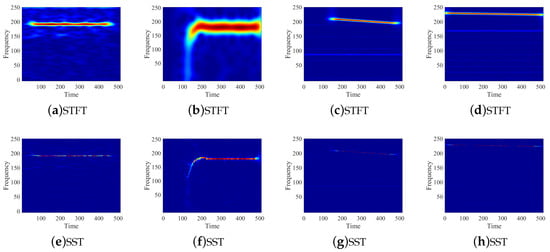 STFT and SST spectrum of Dataset, the signal in (a) and (e) is from DatasetI, the signal in (b) and (f) is from DatasetII, the signal in (c) and (g) is from DatasetIII, the signal in (d) and (h) is from DatasetIV.