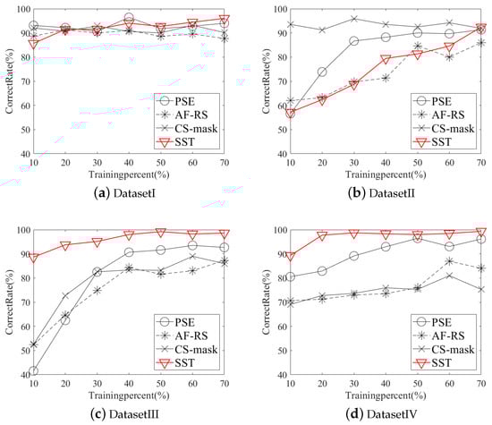 The extracted SST features of each data set are then sent to the classifier for training and identification. The training rate is set from to , and deep neural network (DNN) with fully connected layers is used as a classifier. The recognition rates under different features are shown in Table 2, Table 3, Table 4 and Table 5 and Figure 12. It can be seen that for DatasetI, SST feature has only an inapparent advantage over the power spectrum (PSE), AF-RS and CS-MASK [,]. For the single-frequency signal in DatasetII, the effect of SST features is even slightly worse than PSE and CS-MASK. It is because the form of single-frequency signals is simple, and the energy is highly concentrated at the origin of AD domain, hence the information extracted by the mask is very complete. From the perspective of PSE, single-frequency signals are time-invariant signals, so one-dimensional energy information can represent signals enough, while SST feature may introduce redundant information which reduces the recognition rate.