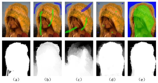 Some pixels are annotated as belonging to definite foreground or definite background. Scribbles only provide a small amount of interaction information, but trimaps can provide more complete interaction information. However, drawing such precise trimaps requires considerable human effort, which is often undesirable, particularly in the case of opaque objects. For example, drawing a trimap like the first row in Figure 1e will take about 50 s. Scribbles are easy to obtain, but they are error prone and inaccurate (Figure 1c) when the foreground scribble pixels are mixed with background pixels, then the generated alpha matte is inaccurate or even wrong. Relatively, user-clicks are more robust than scribbles. To fully extract meaningful foreground objects and minimize the user’s annotation workload, our algorithm takes advantage of a few user-provided clicks and directly generates trimaps for image matting (Figure 1d).