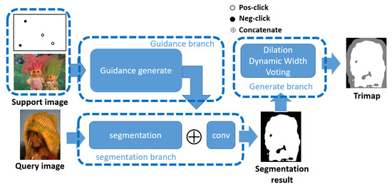 After the above analysis, we aimed to reduce the amount of user interaction while maintaining alpha matte accuracy. Our goal was to obtain the trimap for any image in an unknown class under, the condition of only one image, and the corresponding pixel level click annotation. We were inspired by one-shot learning and propose a three-branched model to generate trimaps. Our model consists of three branches: the guided branch to extract the guidance from the annotated image, the inference branch obtains the segmentation results of the unlabeled image given guidance, and the generated branch converts the segmentation results into a trimap (Figure 2).