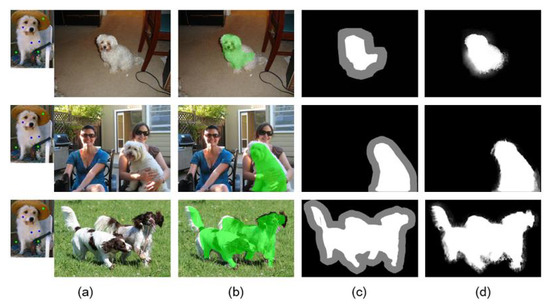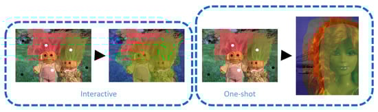 One-shot semantic segmentation recognizes object regions from invisible categories with only one annotated sample serving as the supervision. Shaban et al. [39] proposed a pioneering applied one-shot learning to the semantic segmentation. They segmented new semantic classes requiring only an image and the corresponding densely annotated label. They constructed the two-branched model OSLSM, which is based on Siamese Network. The network is divided into conditioning and segmentation branches, where the conditioning branch supports image–label pairs and produces dynamic parameters for a segmentation branch. They used the conditioning branch to perform dense pixel-level prediction on a test image for the new semantic class. This process adds a convolutional layer after the FCN [34], and the parameters in this convolutional layer are provided by generated dynamic parameters. However, OSLSM still needs users to provide pixel-level annotation information for support images. It is also unstable during optimization; different support image–label pairs produce the same task parameters. Rakelly et al. [40] proposed the REVOLVER model, which requires an image and its pixel-level annotated label, minimizing user interaction workload. REVOLVER only need users to provide a few clicks for the support image (these clicks are located in the absolute foreground and the absolute background). Differing from the OSLSM, which generates dynamic parameters, REVOLVER adopts the distance metric method. It calculates the distance between query features with the foreground representation and background. REVOLVER achieved similar result as OSLSM with only a few pixel-level annotations. Xu et al. [41] introduced the state-of-the-art deep interactive object segmentation (DIOS). They transformed users’ positive and negative clicks to Euclidean distance maps and train a full convolutional neural network to recognize “object” and “background” based on training samples. However, it was not designed to generate trimaps. In particular, DIOS cannot propagate annotations across different images (Figure 3). This is a bottleneck on annotation efficiency, since it requires at least two annotations for every input, whereas our method can segment new inputs independently.