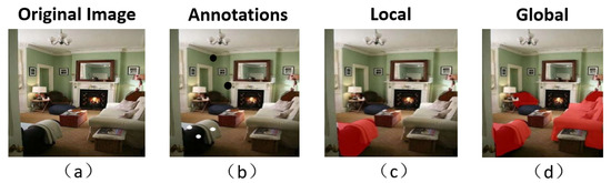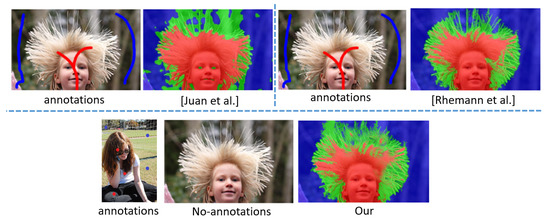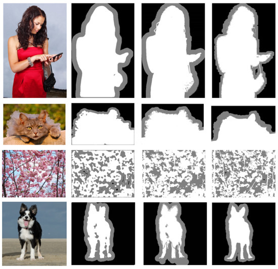 The spectral matting algorithm [3] and automatic trimap generation algorithm [4] automatically extract the matte from the input image without any user intervention. However, the limitation of these methods is that they assume that there is one single object present in the given scene. When multiple semantic targets appear in a scene, the generated result is not the user’s interest region. For example, cats and dogs could appear in the same image. If we want to obtain the alpha matte for cats, the dogs should be seen as the background. The generated result cannot correctly address the user’s interest in these cases. Hsieh et al. [5] proposed a method to automatically obtain trimaps, but their algorithm took the original image and the segmentation results as the input, which is the segmentation result obtained by the user’s interaction. Therefore, ref. [5] requires similar constraint information for the base scribble algorithm. Computers cannot replace us when deciding which parts to target. Providing interactive information is a prerequisite for implementing the algorithm.