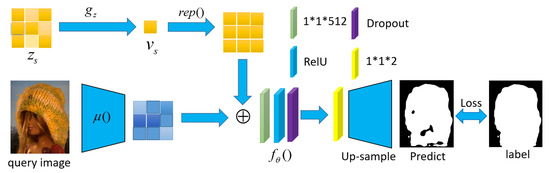 The same as for the guidance branch, we extract visual features from the query image using a deep convolution network , as with the support image, where and represent the length and width of support image respectively. is the globalized task representation obtained by the guidance branch. ⊕ represents the channel number stack. We repeat guidance vector until its spatial dimension is equal to query features maps to ensure the parameters have the same dimension. is a small convolutional network that fuses the query-support feature and decodes to a binary predicted segmentation result. can be interpreted as a learned distance metric for retrieval from support to query. The distance metric part consists of two components. The first component fuses query-support features through one combination of the convolution layer ( kernel size), rectified linear units (ReLU), and drop-out, and the parameters in the convolution layer are used to compute the distance between pixels from support to query. The outputs of this component are coarse distance metric maps. The second part only includes one layer of convolution ( kernel size) with a channel dimension of 2 to predict scores for foreground and background classes at each of the coarse distance metric maps. The second part is followed by bilinear upsampling for end-to-end learning by back-propagation from the pixel-wise loss. The segmentation process is shown in Figure 6.