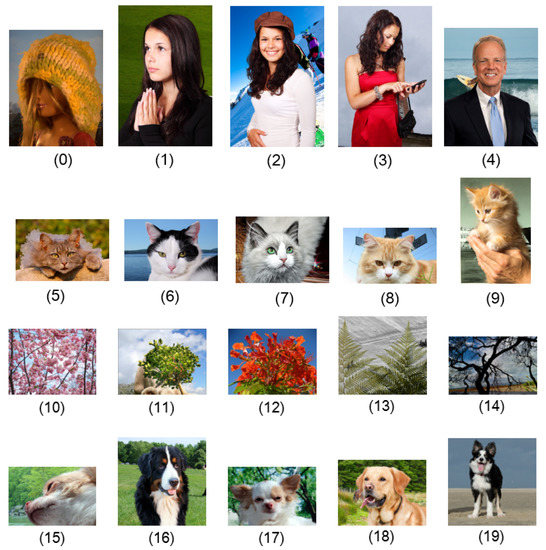 We select twenty images from [13]. Each row has the same category corresponding to Table 1, from top to bottom represents persons 0–4, cats 5–9, plants 10–14 and dogs 15–19, respectively. Subscripts represent image numbers.