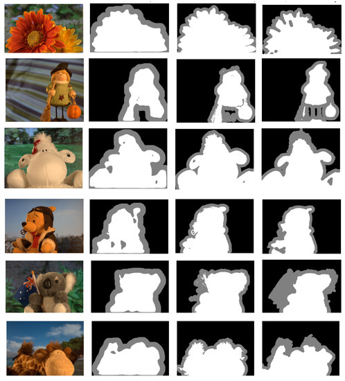 Experiment 4: At first glance, the proposed method is similar to interactive matting algorithms like graph-cut. So, in this experiment, we proved the differences and further verified the model’s ability to transmit guidance in the same semantic class. We selected more complex foreground images from [42] and set the support image and query image are the completely different (semantic category consistency), as shown in Figure 11a. The first row to the last row represent different spatial positions, different foreground objects, and multiple foreground objects, respectively. The query image is overlaid with our predicted mask in green (Figure 11b). The experimental results showed that when the difference is huge in the morphological and spatial position of the foreground target between the query image and the support image, the task representation still can guide the query branch to obtain a relatively accurate result. However, graph-based methods cannot transmit task representation between different images like our proposed method. To verify the advantages of our method from the previous methods, we compare our system with interactive trimap segmentation methods (e.g., [14,17]), a partial visualization of the experimental results is provided in Figure 12, the trimaps are covered by RGB color. Our results (second row in Figure 12) is visually similar to the interactive segmentation methods (first row in Figure 12), since our deep learning based model better combines the depth features, and the CRF further optimizes the segmentation results. Besides, the results further prove guidance ability of our model, which delivers the semantic representation between different query and support images.