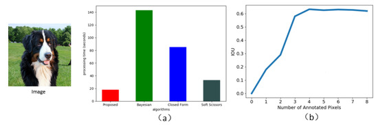 (a) The processing time of different methods. (b) The amount of interactive annotations in the image.