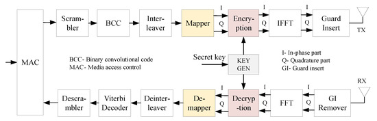 Figure 1 shows a block diagram of the PHY layer of a basic wireless communication system when implementing PLE. At the transmitter, data received from the MAC layer are scrambled, encoded by Binary convolution code (BCC), interleaved, and mapped into the constellation of predefined modulation. The modulated data are then encrypted by the ciphering key generated from the “KEY GEN” block. “KEY GEN” can be any cryptography algorithm such as Grain, RC4. Because data are encrypted after modulation, both modulated data streams (in-phase part (IP) and quadrature part (QP)) must be encrypted. The processing inside the encryption determines how the ciphering key makes a change to the modulated data. At the receiver side, the decryption is executed oppositely to recover the IP and the QP of the modulated symbols. In order to decrypt data successfully, the receiver must implement the same cryptography algorithm and keep the same secret key as the transmitter does.