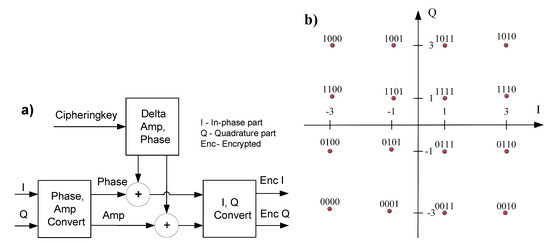 Figure 2a. At the same time, the value of the ciphering key is converted into the equivalent delta phase and delta amplitude. The encryption is performed by adding or subtracting the phase and amplitude of the modulated data with the delta phase and amplitude, respectively. Finally, the encrypted phase and amplitude must be converted back to the corresponding IP and QP components. This approach is considered to be high security because it encrypts all components of the modulated data. However, it remains two main disadvantages. Firstly, the encryption is expected to degrade the PER performance of the communication system because the encrypted data no longer locates in the constellation of modulation. As a result, the receiver has more difficulty in recovering the transmitted data and thus produces more error detection. Secondly, the complexity of encryption is high and is proportional to the complexity of modulation.