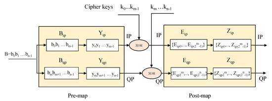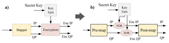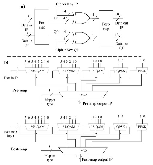 Figure 6a shows the overview hardware architecture of JEM’s encryption. It consists of a PRE-MAP block, POST-MAP block, and XOR-encryption. The PRE-MAP block converts input data into continuous positive values. Then the POST-MAP block maps data into the corresponding values of modulation constellation. PRE-MAP and POST-MAP are designed so that they support multiple modulation types such as BPSK, QPSK, 16-256 QAM.
