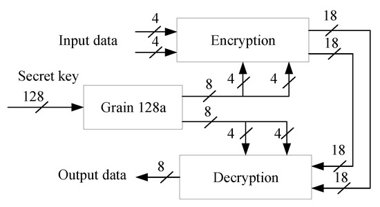 Figure 5 presents the overview hardware architecture of the JEM encryption and decryption process. It consists of three blocks, i.e., encryption, decryption, and stream cipher Grain 128a. The input data is encrypted in the encryption block using cipher keys generated by the Grain 128a block. Similarly, the decryption block decrypts the encrypted data produced by the encryption block. For the sake of comparison, we also designed the hardware of the conventional encryption and decryption method in [