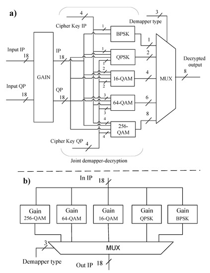 Figure 7a shows the overview hardware architecture of JEM decryption at the receiver side. It consists of a Gain block, joint demapper-decryption, and a MUX block. In this regard, the gain block is responsible for recovering any decrease in the amplitude of the input data by multiplying with a corresponding gain constant of each modulation type, as illustrated in