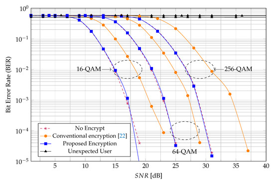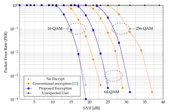Firstly, the proposed JEM has nearly the same BER and PER performances as the unencrypted system for all modulation types (16-QAM, 64-QAM, and 256-QAM). This means that the proposed JEM does not degrade the BER or PER performance. The reason is that the proposed JEM does not change the constellation of modulated symbols. Consequently, it does not affect the error correction performance of the system. Secondly, these figures also show that the conventional method in [