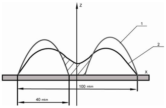The toner consists of fine elementary particles with an average radius of 0.1–0.2 µm. The thickness of the finest lines, which can be created based on electrophotography, is 40 µm [23] (see Figure 1, curve 1). Nonetheless, when analyzing the formation of wider lines, we observe an edge effect on the copy obtained, which is shown in Figure 1. (curve 2). In this Figure, we can see that there are no gaps between the lines, as opposed to the thin lines, but there is a valley of a curve as shown in the shaded area.