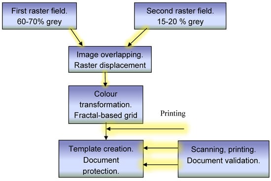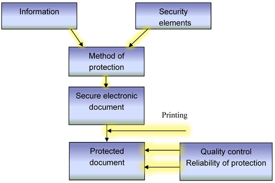 By means of the developed software, the information needed is combined with security features, and an electronic file in PDF format with protected information is created, which allows printing with the maximum quality that this output device has. Thus, it is possible to realize printing the protected information with a resolution of 3000 dpi and above. The limitation of printing resolution is created only by capabilities of an output device for printing [25]. The flowchart of the information technology for protection for printed documents is presented in Figure 2.