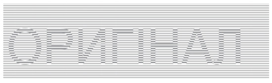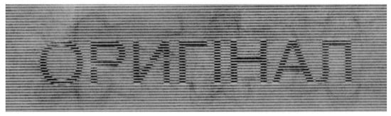 This method of security element formation makes it possible to examine the document authenticity as follows: a template printed on a transparent film, as shown in Figure 5, was laid on a security element, which is shown in Figure 6. With the template being shifted by a half step, the inscription “OPИГIHAЛ” was seen in a light tone, and with the template being shifted downwards, the inscription changed into a dark tone. Moreover, it can be seen that the tone changed sharply. If an authentic document was duplicated, narrow gaps between the lines lost their sharp contours (see Figure 4) because they were filled with toner powder. Thus, it was impossible to see the inscription in light-dark tones. This is demonstrated in Figure 9. This way of protection refers to visual and does not require devices to detect a forgery. It is advisable that line thickness be selected from the calculated values of printing elements feathering and the relative size of a raster point.
