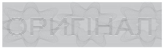 To verify the authenticity of the document for observation of the latent element regarding security features, a template was used (Figure 6) containing a grid with a linear raster whose frequency was equal to raster lines per inch of the latent image with the relative area of raster elements amounting to grey level at 40–45% of the maximum.