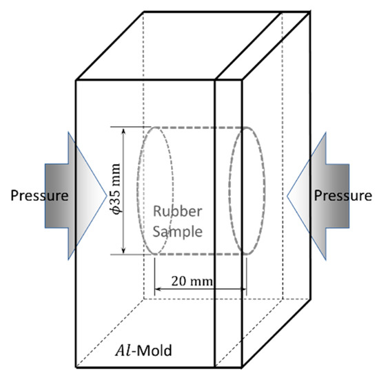The samples in Table 1; Table 2 were vulcanized via different methods. The sample for visualizing thick rubber curing was made with a mold, illustrated in Figure 1, that cured samples 35 mm in diameter and 20 mm thick. The vulcanization conditions were a pressure of 10 MPa and a temperature of 150 °C. For THz-TDS analysis, the cured thick rubber sample was sliced into six -mm-thick pieces, as shown in Figure 2. For THz absorbance spectra, 25 points in the central part of each sliced piece were evaluated. In the case of silica dispersion, masterbatch mixing, final mixing samples, and cured samples were used and imaged with a scanning electron microscope (SEM, CARL ZEISS AG, Ultra55), in addition to the THz-TDS characterization. The cure conditions were 10 MPa pressure at 160 °C. Here, we describe the experimental results of visualization of vulcanization and filler dispersion. These two conditions affect the quality of the rubber products considerably, and they are the main subject of concern of rubber manufactures; however, it was difficult to obtain their information rapidly and destructively using conventional techniques.