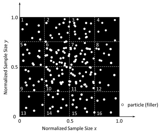 where is the counting function, is the number of random nodes, and is the point set. This value varies from 0 to 1, where smaller values indicate better dispersion. Because calculating this discrepancy is cumbersome even on a computer [12], a “simplified discrepancy” was used based on the concept of the discrepancy in this study. The idea of the new parameter is shown in Figure 4. The evaluated sample was equally divided into 16 areas to count the particle (filler) after image binarization. The ratio of filler number to the total filler number in the sample was calculated, it was then subtracted by the normalized area section in each divided area, and its absolute value was calculated. Finally, the “simplified discrepancy” was obtained as the mean value over the 16 divided areas. The equation is as follows: