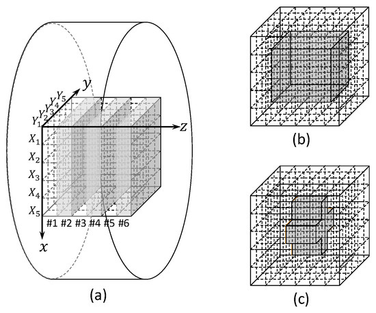 Thick rubber sample for detailed analysis in this study. (a) Coordinate axes and sliced areas (#1~#6) in the sample, (b) the “around the center” (36 points) and its surroundings (“edge,” 114 points), and (c) the center (10 points) and its surroundings (“edge,” 140 points).