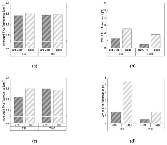 Comparison of the THz absorbance and the CV values of the THz absorbance in each section of T90 and T100 samples. (a) and (c) averaged THz absorbance in “around the center” and central part, and (b) and (d) CV of THz absorbance in “around the center” and central part, respectively.