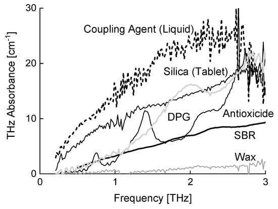 Previously the dispersion visualization of CB, the most general filler in rubber, was reported [10]. Here, silica was visualized because it is a significant filler in ecological automobile tires. Because several unmeasured additives were used in the samples, THz absorbance spectra were evaluated for each of the new additives, as shown in Figure 7. The identification of observed peaks was not performed in this study. By considering the amount of each reagent used in Table 2, it was found that the diphenylguanidine (DPG), antioxidant, and wax were negligible in the THz absorbance of the rubber sample as much as other vulcanization accelerators and vulcanizing agent. Silane is an essential chemical material when silica is used as a filler in rubber products because silica cannot be uniformly distributed due to silanol groups on the silica surface. The silane bis(3-Triethoxylpropyl) tetrasulfide (TESPT in Table 2) reacted with silica at temperatures less than 140 °C, shown in Figure 8 [13,14]. The THz absorbance change due to this reaction was monitored in a preliminary experiment that used powdered samples. Because the bulk density of the powdered silica was approximately one-half that of the tablet silica, in addition to a scattering of THz light by powdered silica, the measured absorbance was smaller than that in Figure 7. When liquid silane was mixed with the silica, the silica tended to clump, and the absorbance spectrum was obtained by averaging three points. In contrast, the absorbance of the pure silica powder sample was stable. After heating at 130 °C for 2 h, the spectra of the mixed powder were as stable as those of the pure silica; however, the THz data were measured at the different three points in the sample and averaged. From Figure 9, it was found that the absorbance increased with silane addition and, after heating (silica-silane reaction), the absorbance decreased. Although the cause of this decrease was unclear (it may be an intermediate product, shown in Figure 8), the results indicated the detection of the silica inside rubber samples.