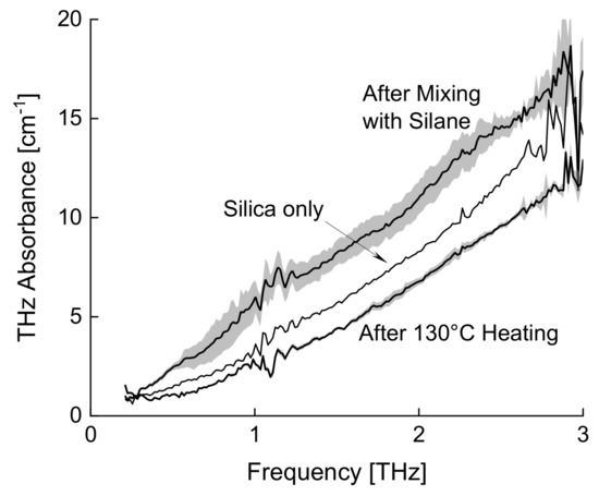 Change of the THz absorbance spectrum by silica-silane chemical reaction. Gray-colored zones mean standard errors.