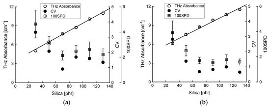 A calibration curve of the silica THz absorbance was used to visualize the dispersion of silica filler inside the rubber samples. Samples made from two different polymers were prepared because SBR polymer, which is the main target and widely used in automobile tires, has a lower viscosity and affects filler dispersion. Isoprene rubber (IR) was selected for comparison because it has a simple structure, a higher Mooney viscosity (stiffer), and an almost equal THz absorbance relative to SBR. When the calibration curves were calculated for silica filler, the same procedure was chosen as that for CB filler dispersion [10]. The THz-TDS system evaluated 25 points in each sample and processed the data to produce absorbance images. The results are shown in Figure 10. Both the IR and SBR samples had excellent correlations between the THz absorbances and the amount of silica. The squared Pearson’s coefficient of correlation, , was 0.994 and 0.990 for IR and SBR, respectively. Comparing the previous results using CB filler, no saturation was observable at higher silica amounts. This suggests that internal scattering or multiple scattering inside the rubber samples was not dominant even in samples having higher filler concentration. This assumption was supported by the fact that remarkable temporal THz waveform degradation [15] was not observed in samples containing silica filler (the waveform is not shown). The parameters of and were plotted together in Figure 10. The was obtained from the integrated absorbance values, which eliminated the THz absorbance spectral fluctuations. In contrast, the reflected the difference in spectral profiles. Increased filler concentration induced more uniform dispersion; thus, the and trends in Figure 10 were acceptable. Furthermore, the variations were comparable. Both samples indicated minimum values at 70 phr silica; however, the cause was not understood. The 70-phr silica possibly matched the quantities of other additives and polymer weights. Figure 10 verified that THz absorbance was suitable for evaluating the silica dispersion, and that the parameter was a potential indicator of spectral uniformity.