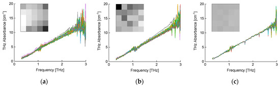 THz absorbance spectra at 25 measured point in various sample condition. (a) Silica masterbatch mixing (unvulcanized), (b) final mixing (unvulcanized), and (c) vulcanized rubber. Inset shows each THz absorbance image.