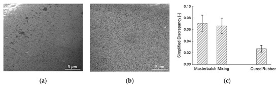 SEM image evaluation of SBR-based sample. (a) Silica masterbatch mixing, (b) vulcanized rubber, and (c) silica dispersion in SEM images derived by simplified discrepancy.