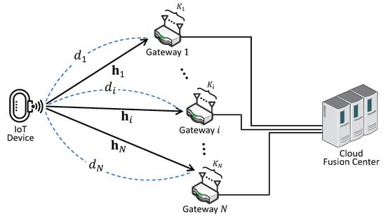 where P denotes the transmission power of the ID and denotes the distance between the ID and the i-th GW. The term denotes the path-loss exponent and x is a signal of the ID, which has a unit power; i.e., . In this paper, it is assumed that the small-scale fading channel between the ID and each GW follows a Rayleigh fading model, such as []. Thus, the fading channel vector from the ID to i-th GW is represented as and follows the identically and independently distributed (i.i.d.) complex Gaussian distribution with zero mean and unit variance; i.e., . The additive white Gaussian noise (AWGN) at i-th GW is represented as , each element of which is identically and independently distributed complex Gaussian random variable with zero mean and variable of . It is assumed that each ID knows the local channel state information by a pilot signal from the ID. At each GW, the maximum ratio combining (MRC) is operated in order to maximize the SNR, and the minimal essential information, a real-valued combining signal, is derived to the cloud server.