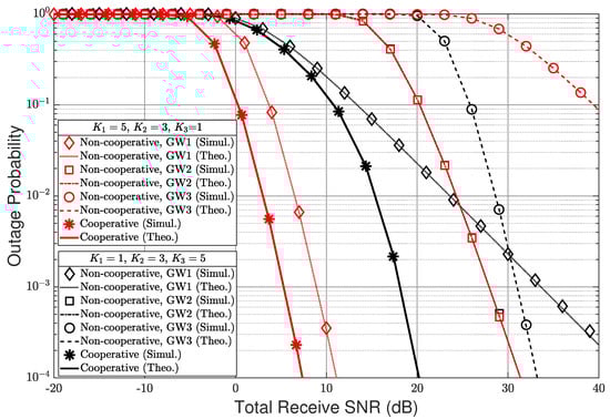 Figure 2 shows the outage performances of uplink LPWAN with non-cooperative and cooperative techniques when , , , , , and . In this figure, the analytic results derived from Equations (8) and (11), are exactly matched with the Monte-Carlo simulation results for all cases of antenna combination. They show that the cooperative technique always outperforms the non-cooperative technique. It also has better performances when the number of antennas of the near GW from the ID is more than the number of antennas of the far GW.