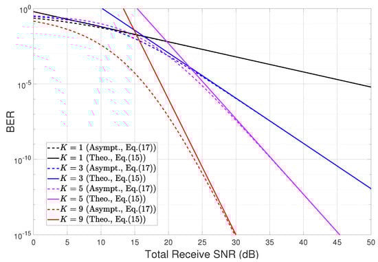 which is used to verify the tendency of BER performance; i.e., the slope of BER curve, in high SNR regime []. The diversity order is obtained through Taylor series expansion for (15), of which the first-order coefficient shows how the system parameters affect the performance in high SNR regime; e.g., the distances between ID and GWs, the number of antennas, pass-loss factor, and so on. An asymptotic expression is given by