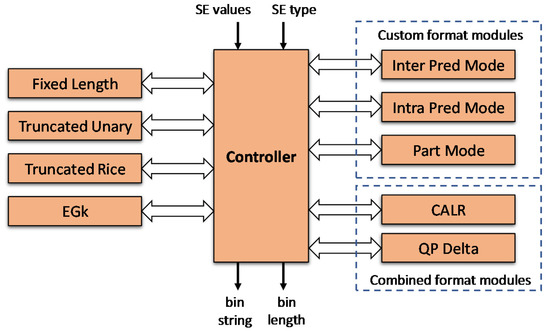 The SEs from the other processes in HEVC have to be buffered at the input of CABAC encoder before feeding into the binarizer, where the process of mapping appropriate bins to each SE occurs. In CABAC, the general hardware architecture of the binarizer can be characterized in Figure 2 [4]. Based on SE values and types, the controller will select an appropriate binarization process to produce bin string and bin length, accordingly. HEVC standard defines several basic binarization processes such as fixed length, truncated unary, truncated rice, and EGk (kth order exponential Golomb) for almost SEs. Some other SEs such as CALR (coefficient absolute level remaining) and QP_Delta (quantization parameter offset value) utilize two or more combinations (prefix and suffix) of these basic binarization processes [14,15]. There are also simplified custom binarization formats that are mainly based on LUT (look-up table), for other SEs like inter-pred mode, intra-pred mode, and part mode.