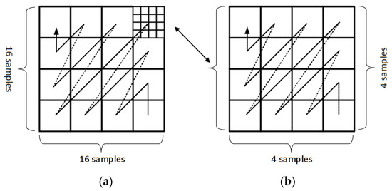 The diagonal scan is applied to divide large TBs into un-overlapped 4 × 4 sub-blocks of coefficients. Then the scan occurs within each 4 × 4 block to form a 1-D array of 16 consecutive coefficients, which is called a coefficient group. The process of diagonal scanning is illustrated in Figure 3 [17].
