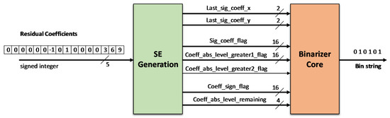 The overall block diagram of the binarization module for residual data processing is composed of SE generation and binarizer core, as shown in Figure 5. The SE generation process involves scanning passes to generate residual SEs as previously described in Figure 4. Then, they are appropriately delivered to and invoked by an equivalent sub-binarization process to generate bin string of each SE. In addition, the binarizer core will output the final bin string of these SEs.